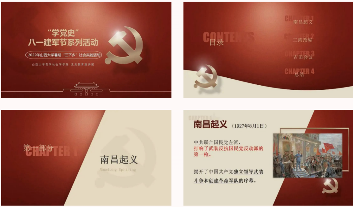 为更好地组织开展党史学习教育主题活动,我们团队在结合地缘特色以及对现实时间节点的考量过后,最终讨论决定深入社区,向青少年朋友们开展“学党史·八一建军节”主题党史宣讲活动。从活动的前期准备工作到最终的线下开展工作,在与团队成员们积极讨论和修改宣讲内容的过程中,我对于建军党史的了解也更加深入,充分地感受到中国共产党领导人民军队,一步步带领中华民族谋幸福、谋发展、求突破,求创新的历程。作为太阳集团tyc138暑期社会实践哲学院睿翼实践团的一员,通过讲述那段战火纷飞的时代,传播党史红色精神,在宣讲中实践贯彻习近平总书记对青年一代“学史明理”、“学史力行”的殷切嘱托,我在感到十分光荣的同时,也感到责任重大。这激励着我在未来将更好地响应党的号召,为中华民族伟大复兴贡献自己的一份力量。