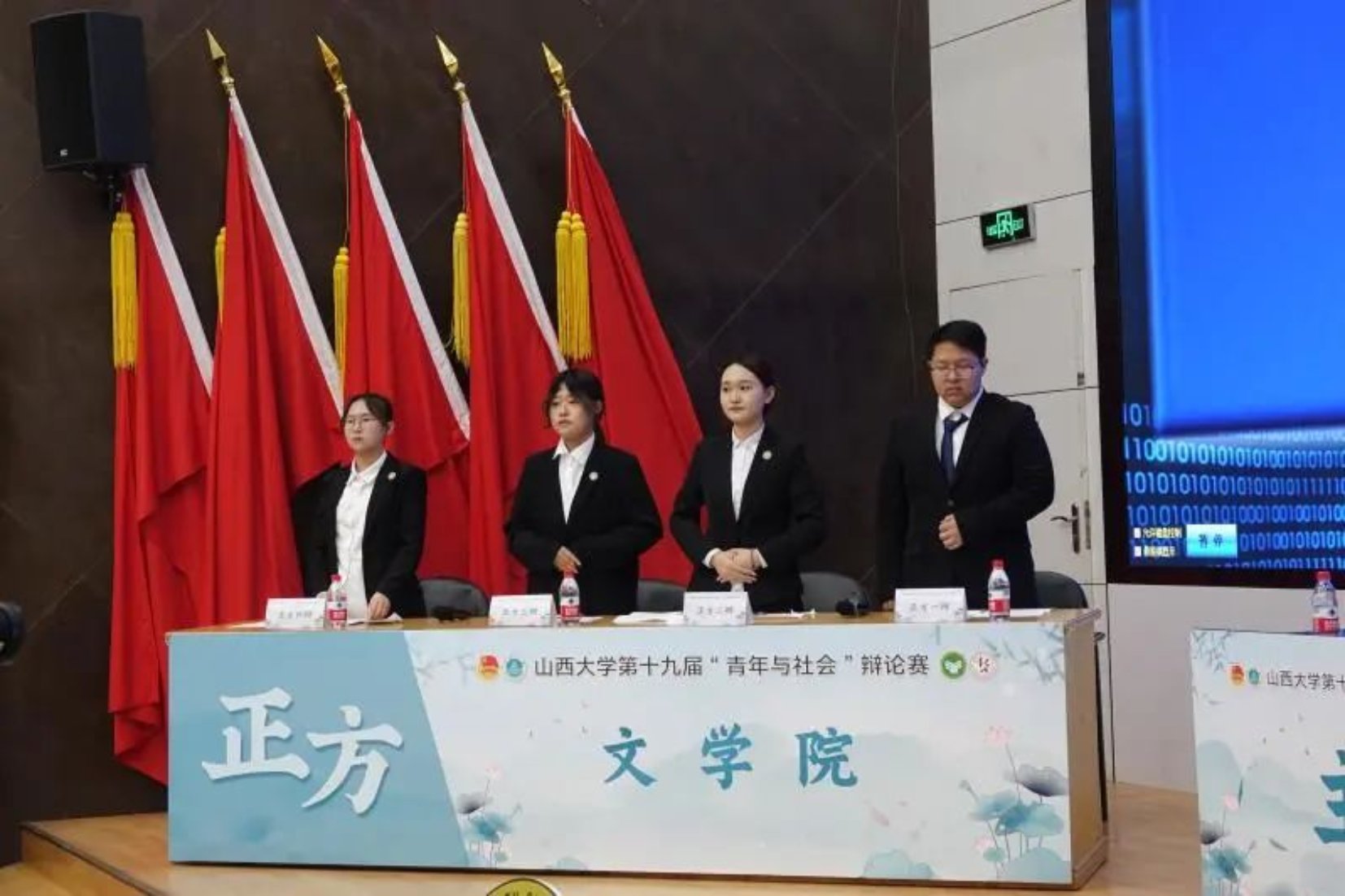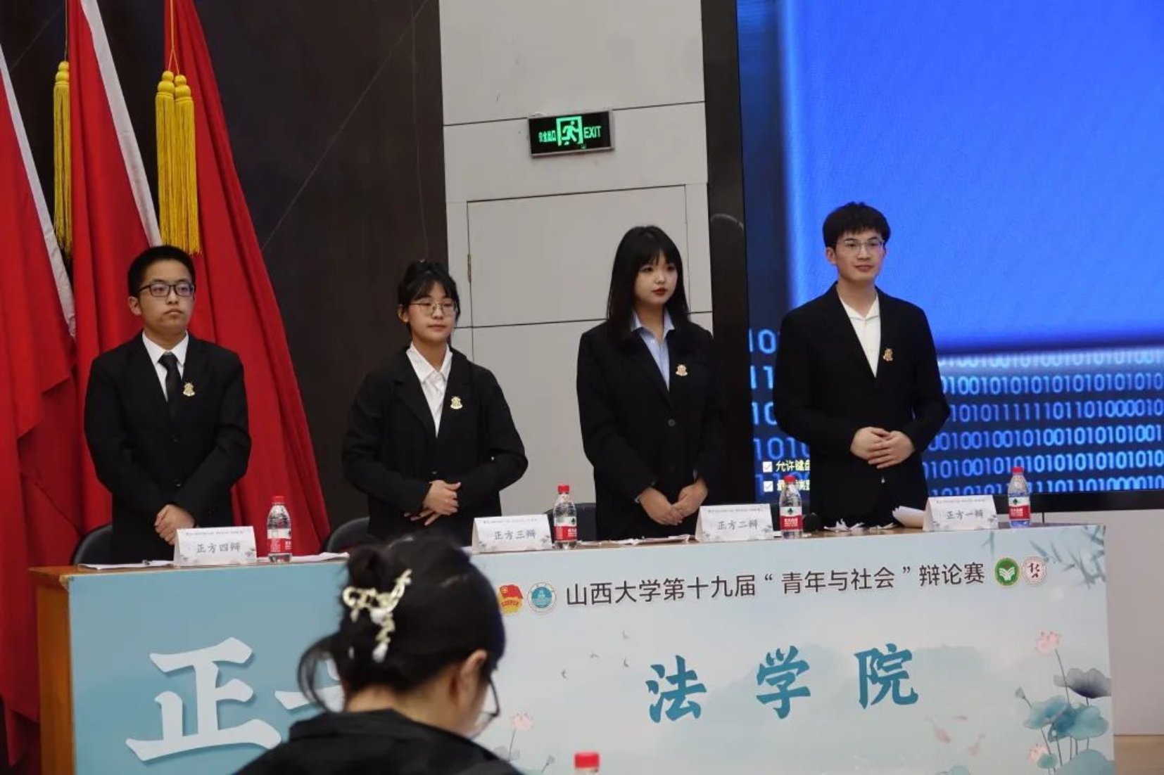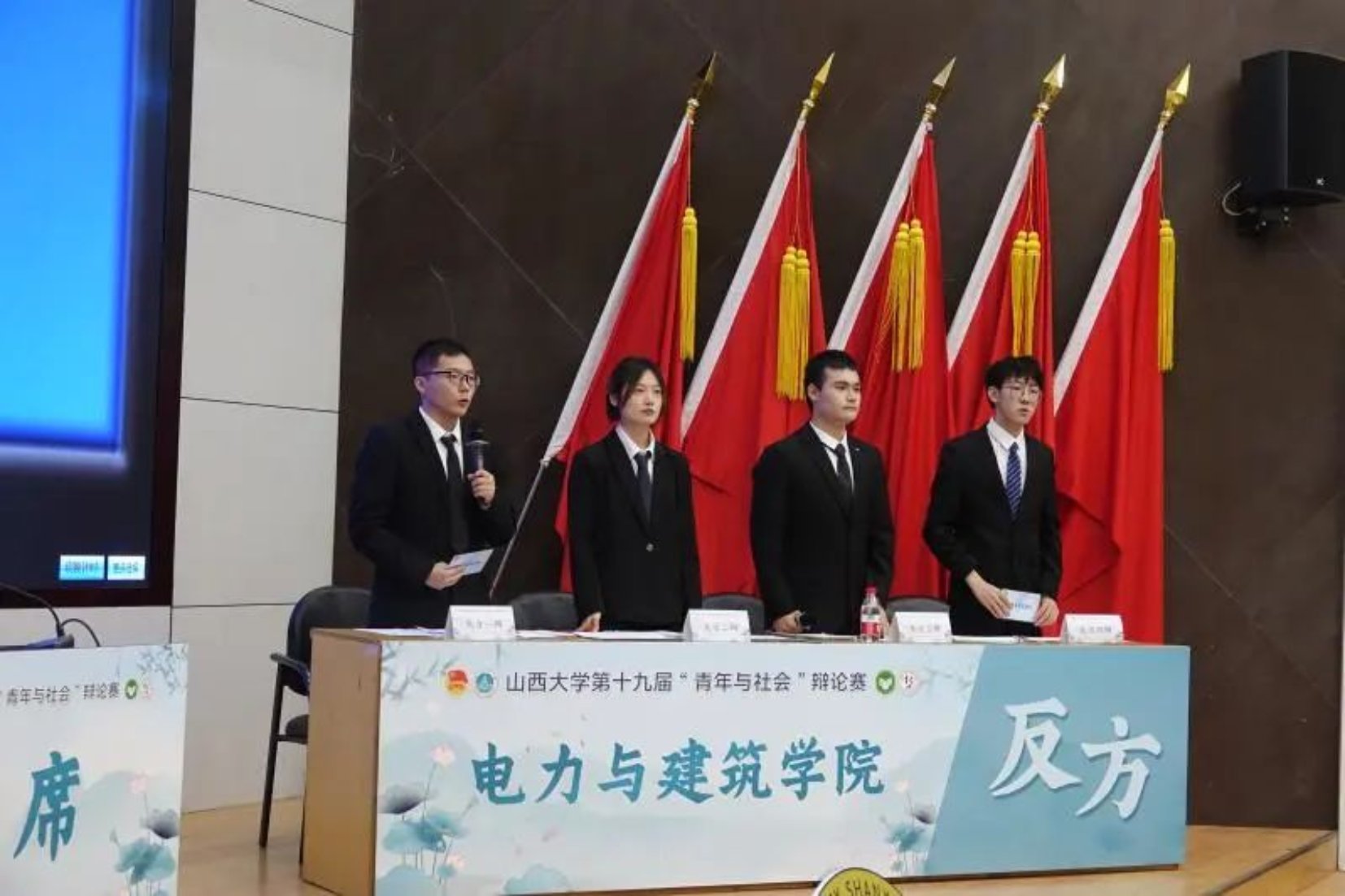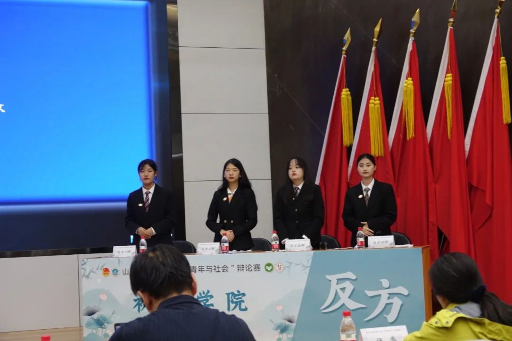 “百廿山大扬正气,清廉校园育桃李”,4月14日下午,第十九届“青年与社会”辩论赛决赛成功举办。出席本次辩论赛的评委老师有:政治与公共管理学院原超老师、教育科学学院任桂平老师、新闻学院赵莹老师、哲学社会学学院郭郁老师、法学院徐大勇老师、文学院赵巧玲老师。各个学院委派的各位评委同学也于前排就坐。