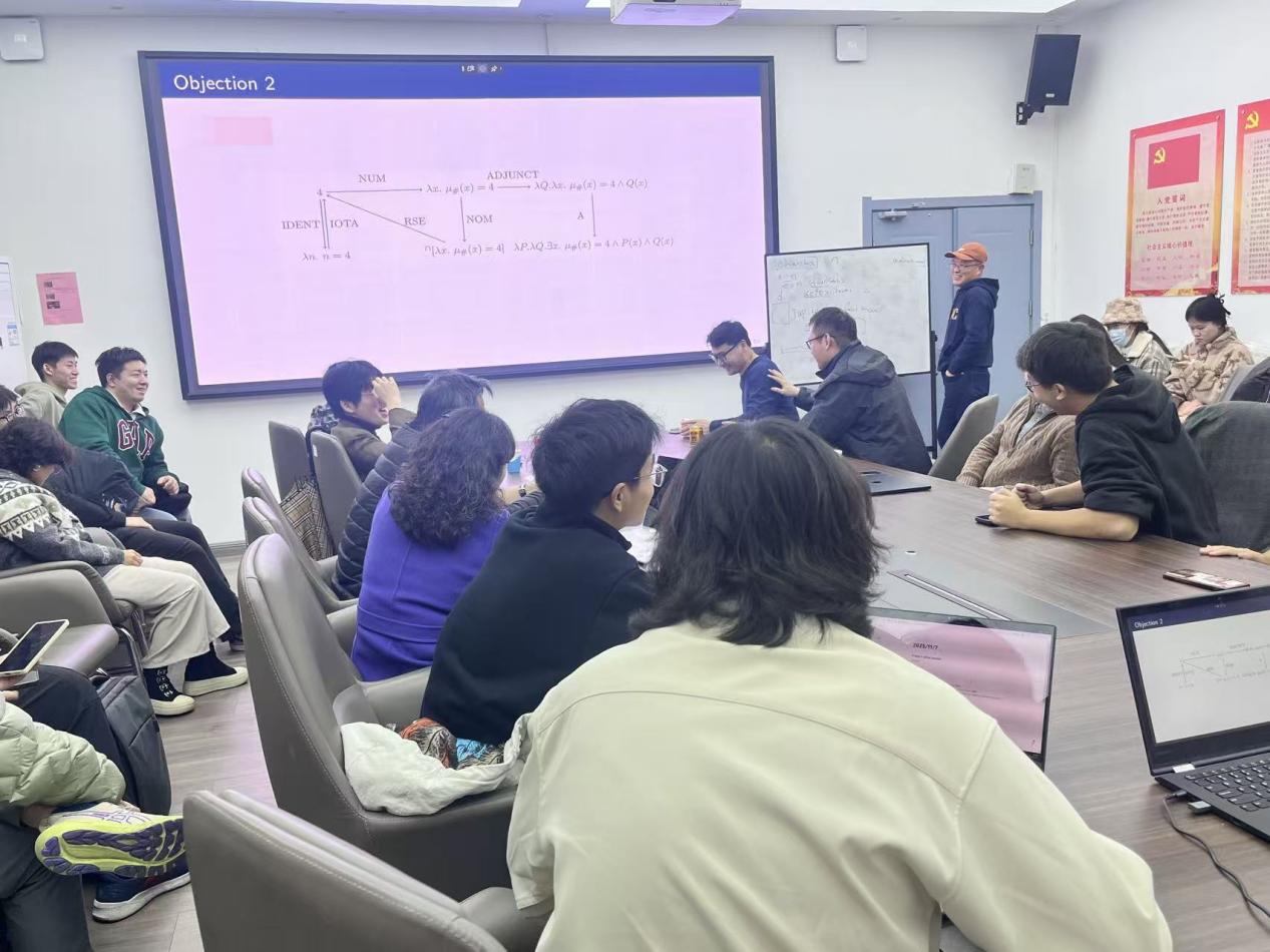 在点评互动环节,学院师生对本次讲座的主题展开热烈研讨。周北海、郭建萍、徐超、王奕岩、叶闯等老师,及参加讨论的部分同学的评论,可概括为对罗广龙副教授解决FOP所提出策略的如下挑战。第一,度不能是为避免困难而对数的一种特设的(ad hoc)解释和规定,需要对为什么如此给出更强的论证,当然也包括对度的非抽象性的更强的论证;第二,相对于同样具有解释功能的许多其他方案,比如使用偏序等等(像周北海老师等指出的那样)的解释方案,采用度的解释为什么更具有理论优势;第三,依赖对“度”的唯名论友好解释的处理方案,如何扩展到虚数等更复杂的且表现出明显抽象性的数;第四,运用类型转换等来处理自然语言的语义有可能过度简化了自然语言本身具有的复杂性,因此削弱了这个方案的解释力。罗广龙老师对大家提出的问题表示肯定且做出回应。本场讲座持续两个小时,师生反响热烈。最后,本次讲座在与会者的热烈掌声中圆满结束。