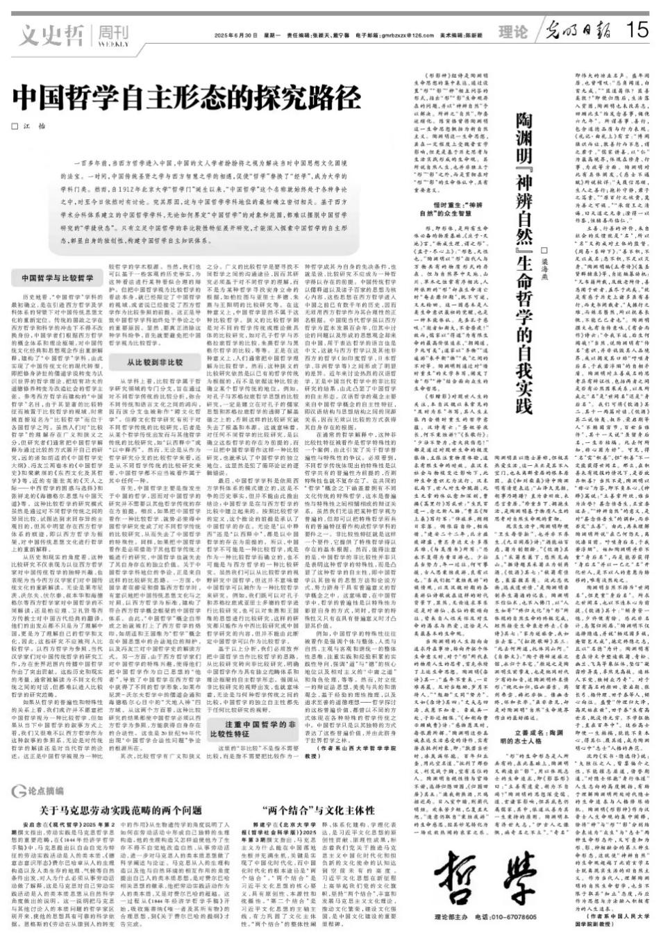 6月30日,江怡教授在《光明日报》哲学版发表头条文章《中国哲学自主形态的探究路径》。文章指出,一百多年前,当西方哲学进入中国,中国的文人学者纷纷将之视为解决当时中国思想文化困境的法宝。一时间,中国传统圣贤之学与西方智慧之学的相遇,促使“哲学”替换了“经学”,成为大学的学科门类。然而,自1912年北京大学“哲学门”诞生以来,“中国哲学”这个名称就始终处于各种争论之中,时至今日依然时有讨论。究其原因,这与中国哲学学科地位的最初确立密切相关。基于西方学术分科体系建立的中国哲学学科,无论如何界定“中国哲学”的对象和范围,都难以摆脱中国哲学研究的“学徒状态”。只有立足中国哲学的非比较性特征展开研究,才能深入探索中国哲学的自主形态,彰显自身的独创性,构建中国哲学自主知识体系。文章详细分析了中国哲学与比较哲学的关系,强调了作为中国哲学自主形态的非比较性特征。